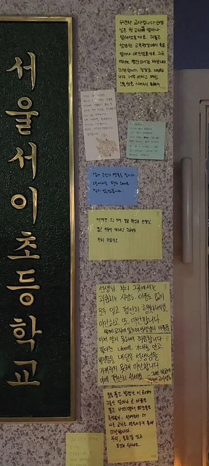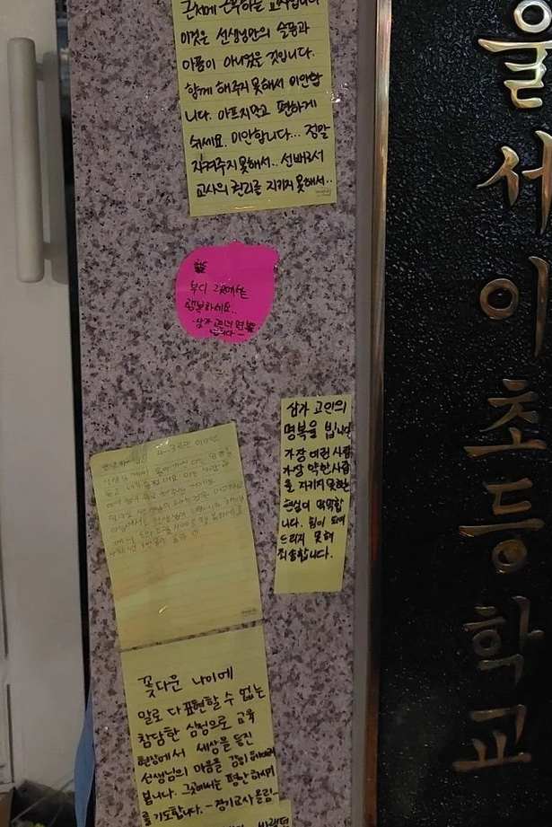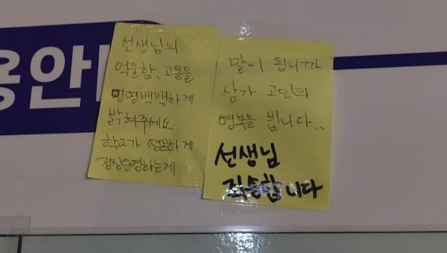 이들 포스트잇에는 "영면하시는 곳에서는 아픔 없길 바랍니다", "선생님의 존귀한 생명이 허사가 되지 않도록 모두가 노력해 교육상황을 바꾸겠습니다" 등의 메시지가 담겨 있었습니다.