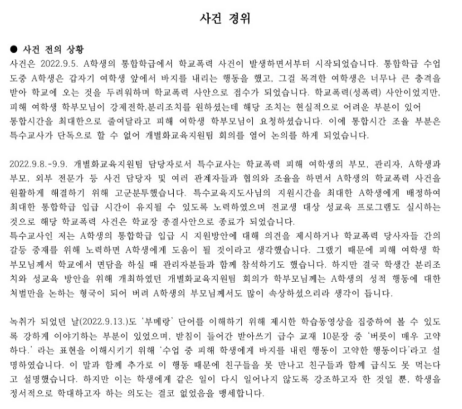 사건은 2022.9.5. A학생의 통합학급에서 학교폭력 사건이 발생하면서부터 시작되었습니다. 통합학급 수업도중 A학생은 갑자기 여학생 앞에서 바지를 내리는 행동을 했고, 그걸 목격한 여학생은 너무나 큰 충격을 받아 학교에 오는 것을 두려워하며 학교폭력 사안으로 접수가 되었습니다. 학교폭력(성폭력) 사안이었지만 피해 여학생 학부모님이 강제전학, 분리조치를 원하셨는데 해당 조치는 현실적으로 어려운 부분이 있어 통합시간을 최대한으로 줄여달라고 피해 여학생 학부모님이 요청하셨습니다. 이에 통합시간 조율 부분은 특수교사가 단독으로 할 수 없어 개별화교육지원팀 회의를 열어 논의를 하게 되었습니다.