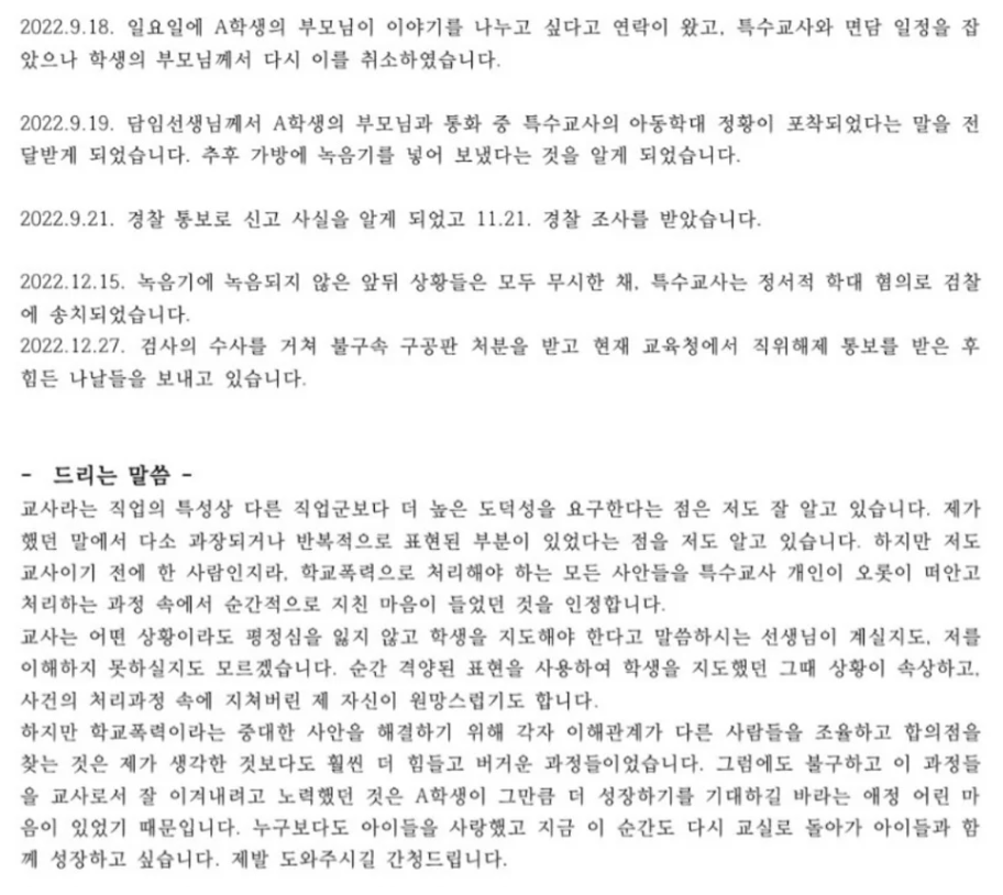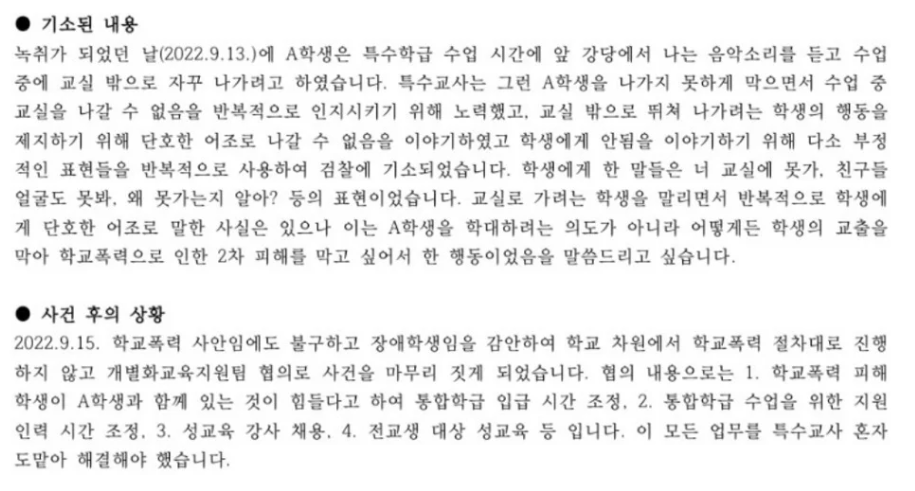 2022.12.15. 녹음기에 녹음되지 않은 앞뒤 상황들은 모두 무시한 채, 특수교사는 정서적 학대 혐의로 검찰에 송치되었습니다.
