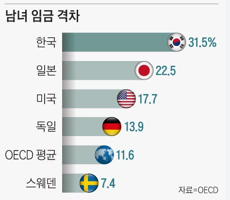 한국의 이런 성별 임금 격차는 국제적으로도 비난받는 수준입니다. OECD 회원국 중에서 한국의 성별 임금 격차는 31.1%로 가장 높았으며, 이는 평균 12.0%에 비해 굉장히 큰 비율입니다.
