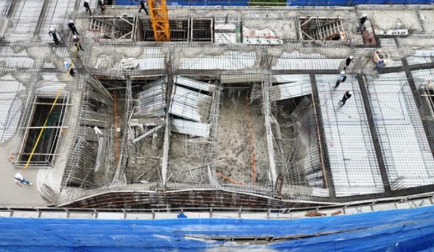 A. 건물 9층의 바닥 면이 무너지면서 사고가 발생했습니다. 당시 9층에서는 바닥 콘트리트 타설 작업이 진행되고 있었는데, 이를 지탱하던 거푸집(가설구조물)과 동바리(지지대) 등이 하중을 견디지 못하고 무너져 낸 것으로 추정되고 있습니다.