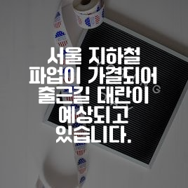 요즘 미세먼지나 대기질이 안 좋아지면서 지하철 이용률이 높아진 요즘, 서울지하철 1~8호선 파업 단행이라는 소식이 진행 중입니다. 다음 주 출근길에 불편함이 예상되니, 참고해주시기 바랍니다.